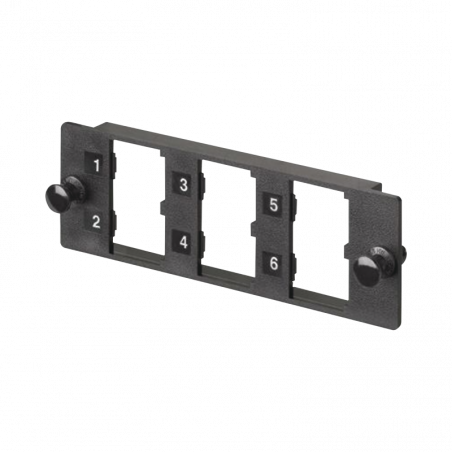 El panel modular multimedia es compatible todos los paneles Opticom. Cuenta con seis puertos para seis módulos Mini-Com® para aplicaciones UTP, fibra óptica y AV.