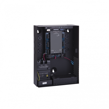 30,000 tarjetas. 20,000 registros (memoria ciclica). 2 entradas para lectora (Wiegand)26 bits. Configurable para 1 o 2 puertas. 2 relevadores para apertura de la puerta. 2 entradas de sensor de estado de puerta. 2 relevadores auxiliares (programables). Bocina de alarma incorporada. Terminales desmonstables de tornillo. Gabinete con fuente (entrada 110 Vca, 1.5, salida 12Vcc, 4 A) con cargador de batería (no incluida). Dimensiones: 326 x 263 x 97 mm. Peso 2.4 kg. Software compatible AXTRAXNG version 27.5.7.8