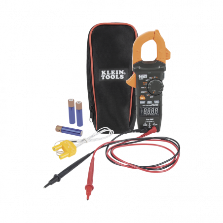 Mide corriente CA/CD y NCVT con una pinza, así como voltaje CA/CD, resistencia, frecuencia, microamperios CD, capacitancia, ciclo de servicio, prueba de diodo y continuidad con cables de prueba, y la temperatura con un termopar.