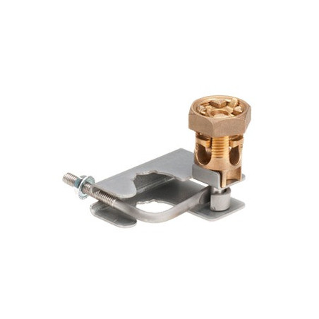 Abrazadera para aterrizar piso falso que adapta hasta dos conductores en tamaños de 16-50mm2, #6-1/0 AWG; 106.4mm de fondo, 85.9mm de ancho, 81.0mm de altura; funciona con pedestales cuadrados de 22mm y redondos de 25mm a 29mm.