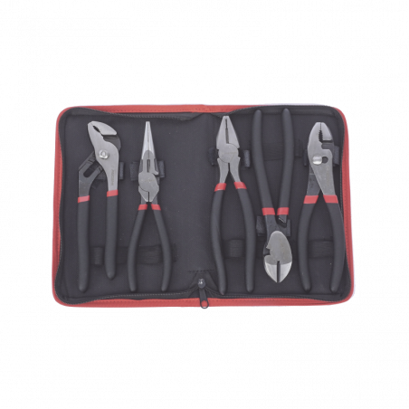 Juego de 5 Pinzas de 8" con Estuche. Incluye: P. Mecánica, P. para Tubo, P. Eléctrica, P. Corte, Nariz Larga.