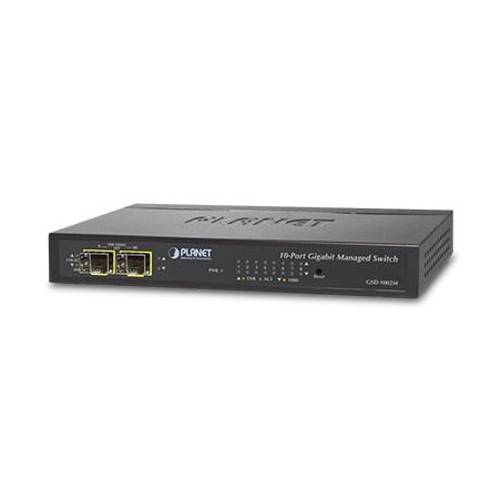 PLANET GSD-1002M es un switch de escritorio administrable SFP de 10/100/1000Mbps + 2 puertos 100/1000X SFP especialmente diseñado para construir una red troncal Gigabit completa confiable para transmitir y reenviar datos a la red remota a través de fibra óptica. Proporciona cobre 10/100/1000Base-T de 8 puertos y 2 interfaces de fibra óptica SFP 100/1000Base-X adicionales con sistema de alimentación dual. Además de la compatibilidad con la estructura de conmutación de 20 Gbps para manejar cantidades extremadamente grandes de video, voz y datos importantes en una topología segura, el GSD-1002M proporciona una interfaz de administración IPv6/IPv4 fácil de usar pero avanzada y abundantes funciones de conmutación L2/L4. Es la mejor inversión para las empresas / SOHO que expanden o actualizan su infraestructura de red.