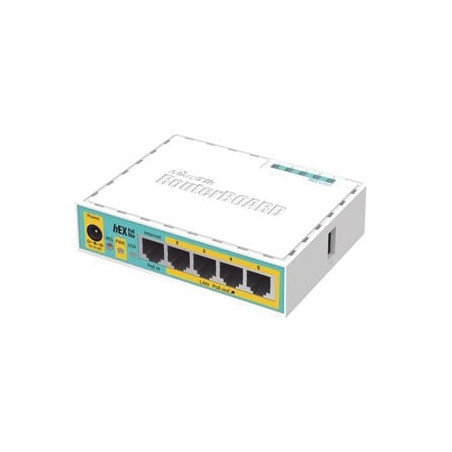 hEX PoE Lite es un pequeño router de Ethernet de cinco puertos en una caja de plástico, que tiene un puerto USB 2.0 y salida PoE.