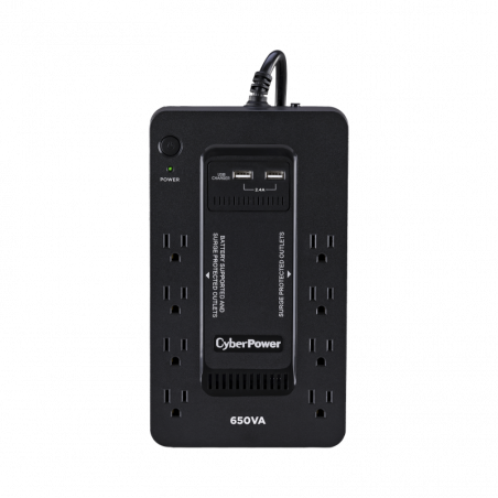 El EC650LCD salvaguarda PCs y otros equipos electrónicos de apagones, bajas y caídas de voltaje, picos y otras anormalidades de energía. Su circuito integrado compuesto ofrece protección avanzada de energía. La tecnología GreenPower UPS™ reduce los costos de energía del UPS y es un producto que cumple con ENERGY STAR®. El LCD multifunción provee al usuario la capacidad de revisar el estado operativo del UPS y asistir en solución de problemas de anormalidades de energía.