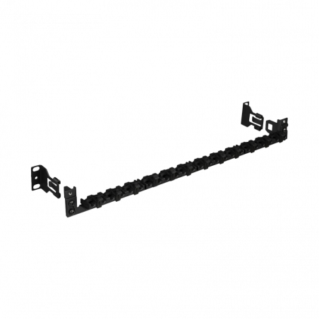 Las barras de protección contra tirones consiste en una barra de metal que se instala en la parte trasera de un rack estándar EIA de 19" para soportar un mínimo de 24 cables que salen de la parte trasera de un panel de conexiones. Los cables se asegurarán con clips ajustables integrados o tiras de velcro. Los soportes de liberación rápida opcionales proporcionarán una manera fácil de quitar la barra de alivio de tensión sin el uso de herramientas.
