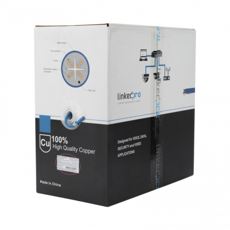 Bobina de cable de 305 metros Cat6+, CMR, CALIBRE 23 ALTO RENDIMIENTO, ETL,UL, color azul, super flexible, para aplicaciones de video vigilancia, video HD, y redes de datos. Uso interior.